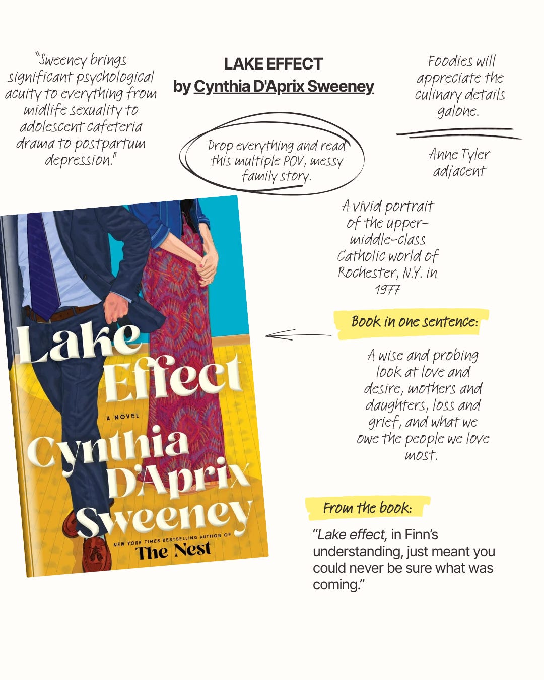 You can get Lake Effect here. I also loved Sweeney’s other family-forward books The Nest and Good Company.